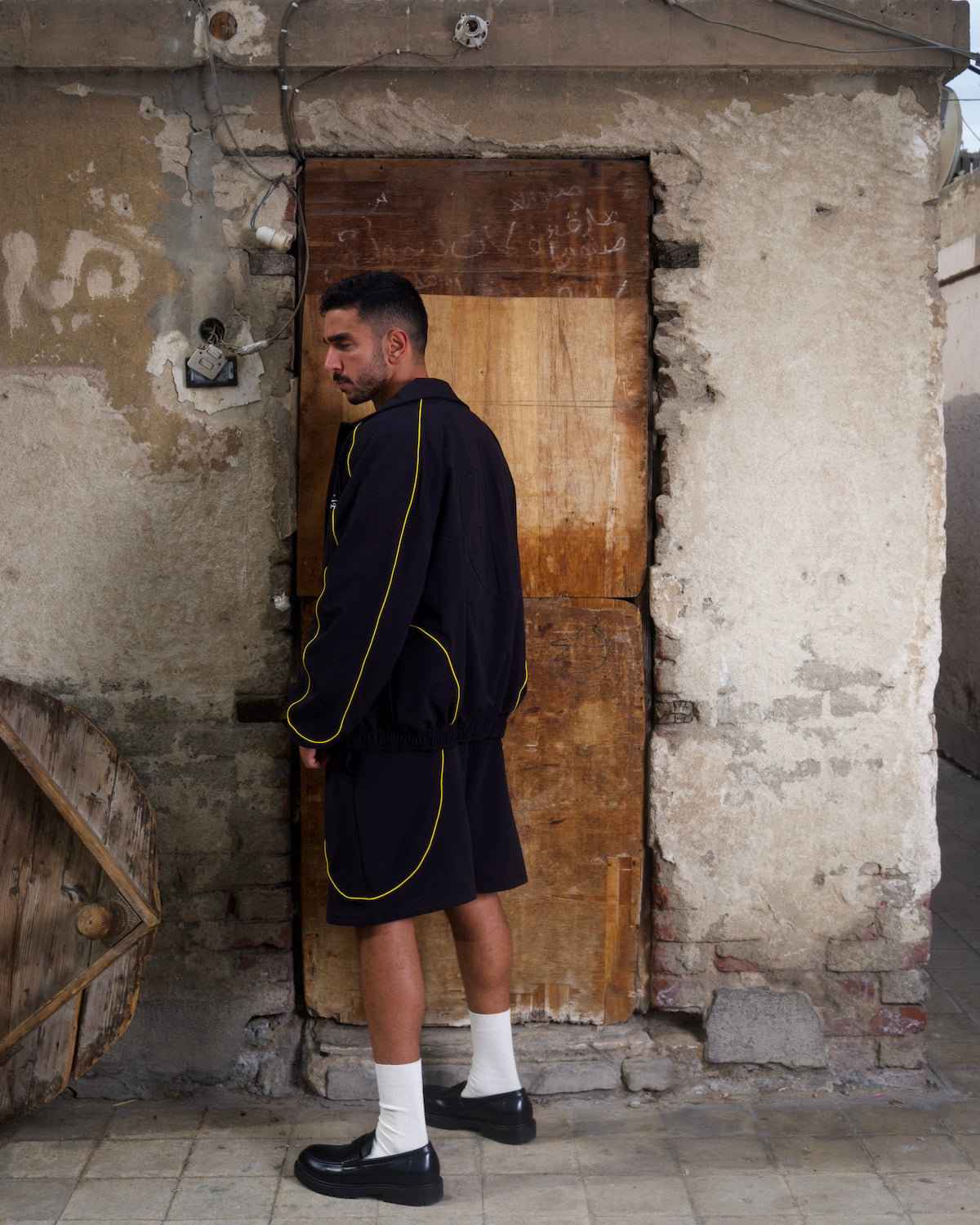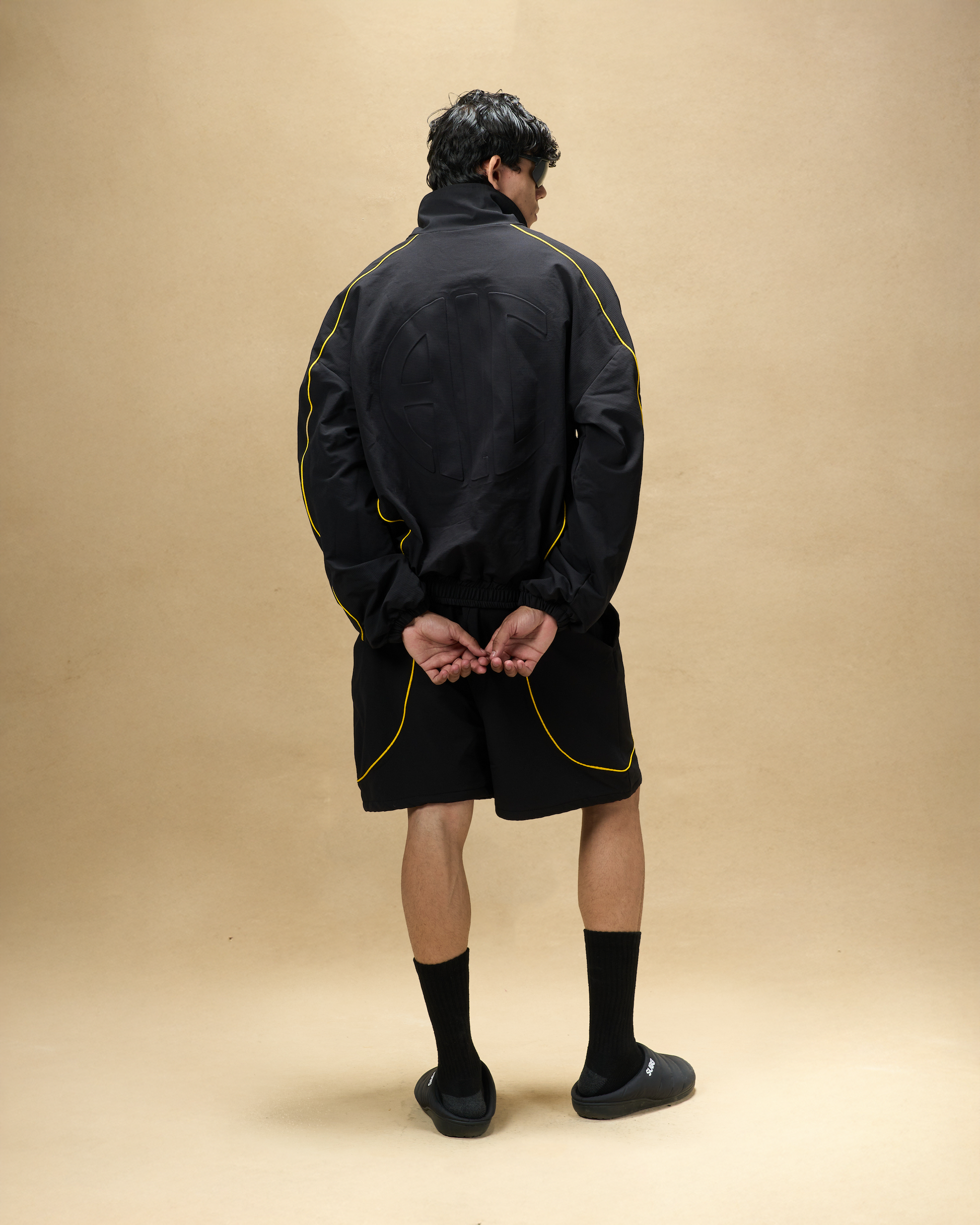 Spread High CollarElasticized Hem And CuffsSeam Pockets Print At FrontAl Camileon Studio Logo Embossed At BackDropped Shoulders