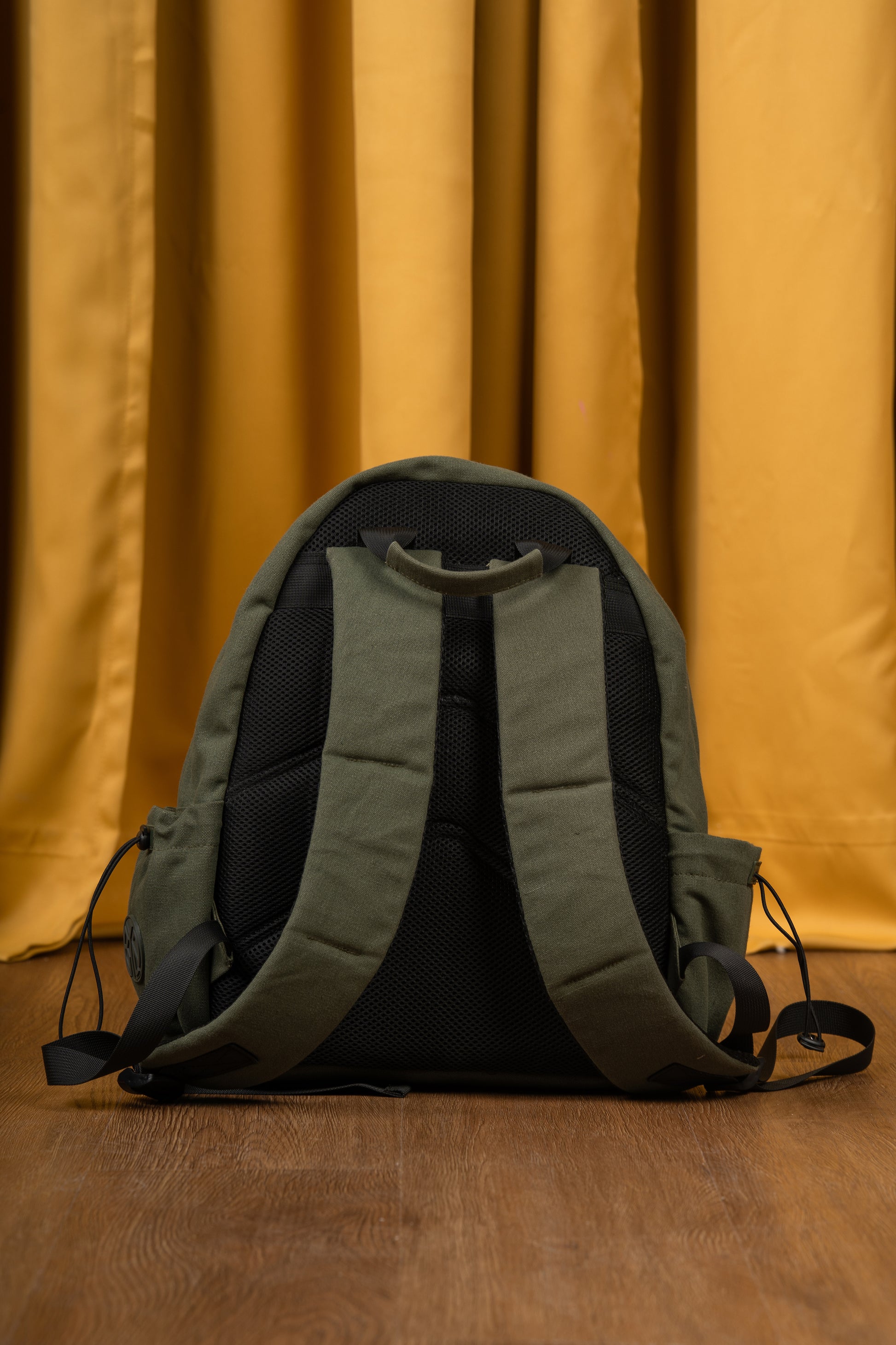Olive backpack with monochrome print, side pockets and a four-compartment interior including a padded laptop section. Built for daily use as part of the Al Camileon Studio X Baynoire collaboration.