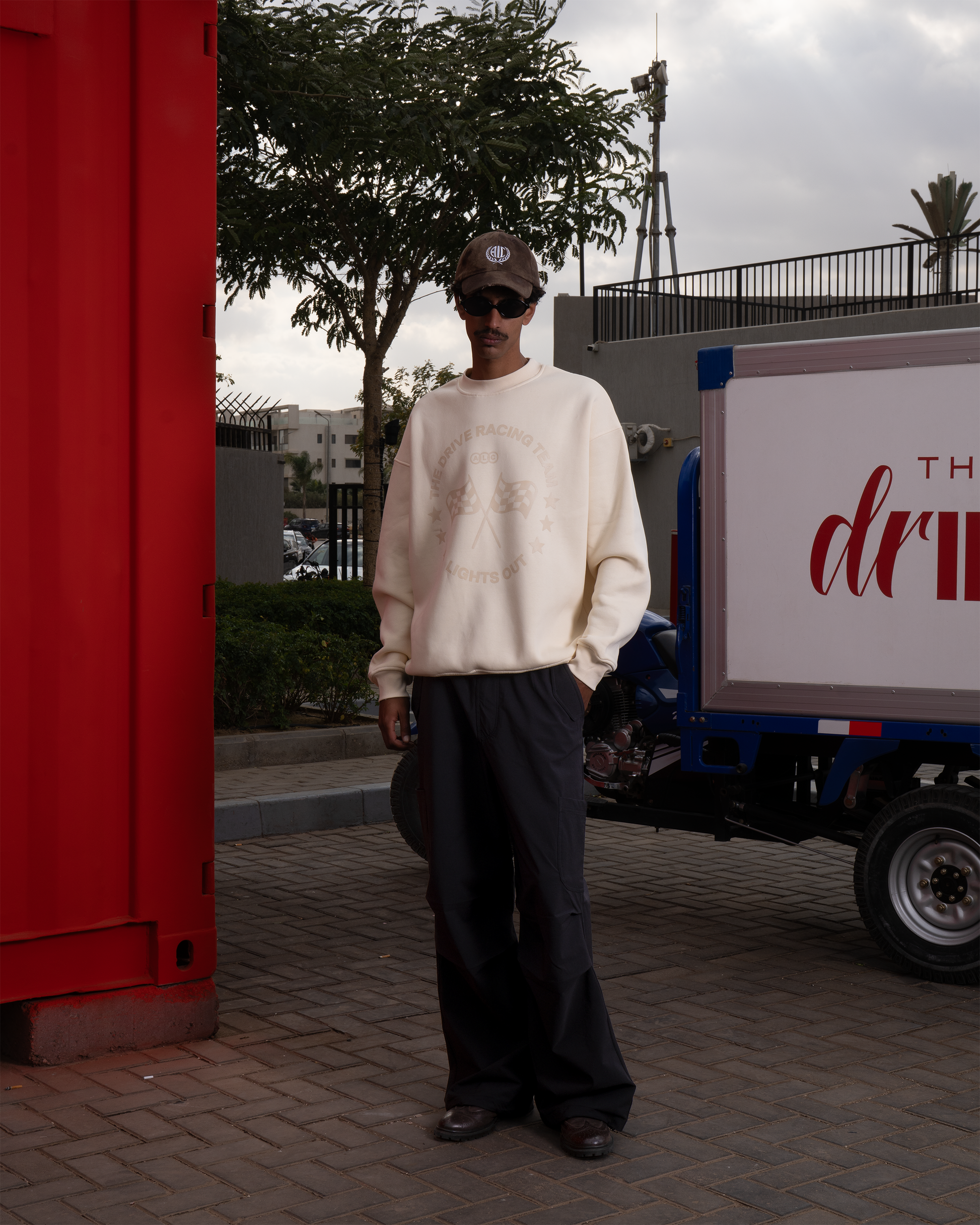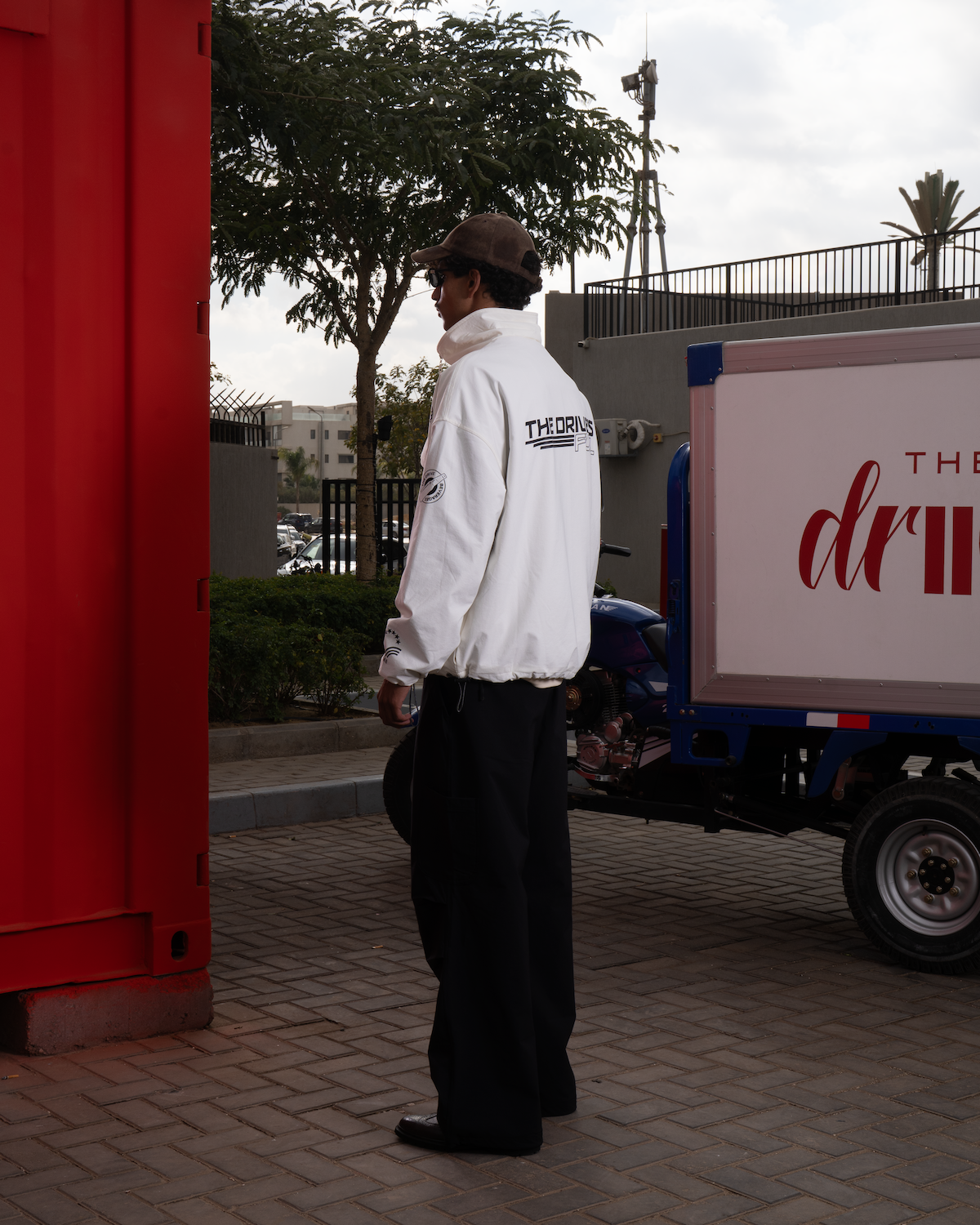 Unisex black cargo pants from Al Camileon Studio × The Driive, designed for movement and everyday wear. Cut in a relaxed fit, featuring two side pockets, two utility pockets on each knee, knee pleats for enhanced mobility, and a back pocket with a small zipper for secure storage, finished with an ALC badge on the back pocket.