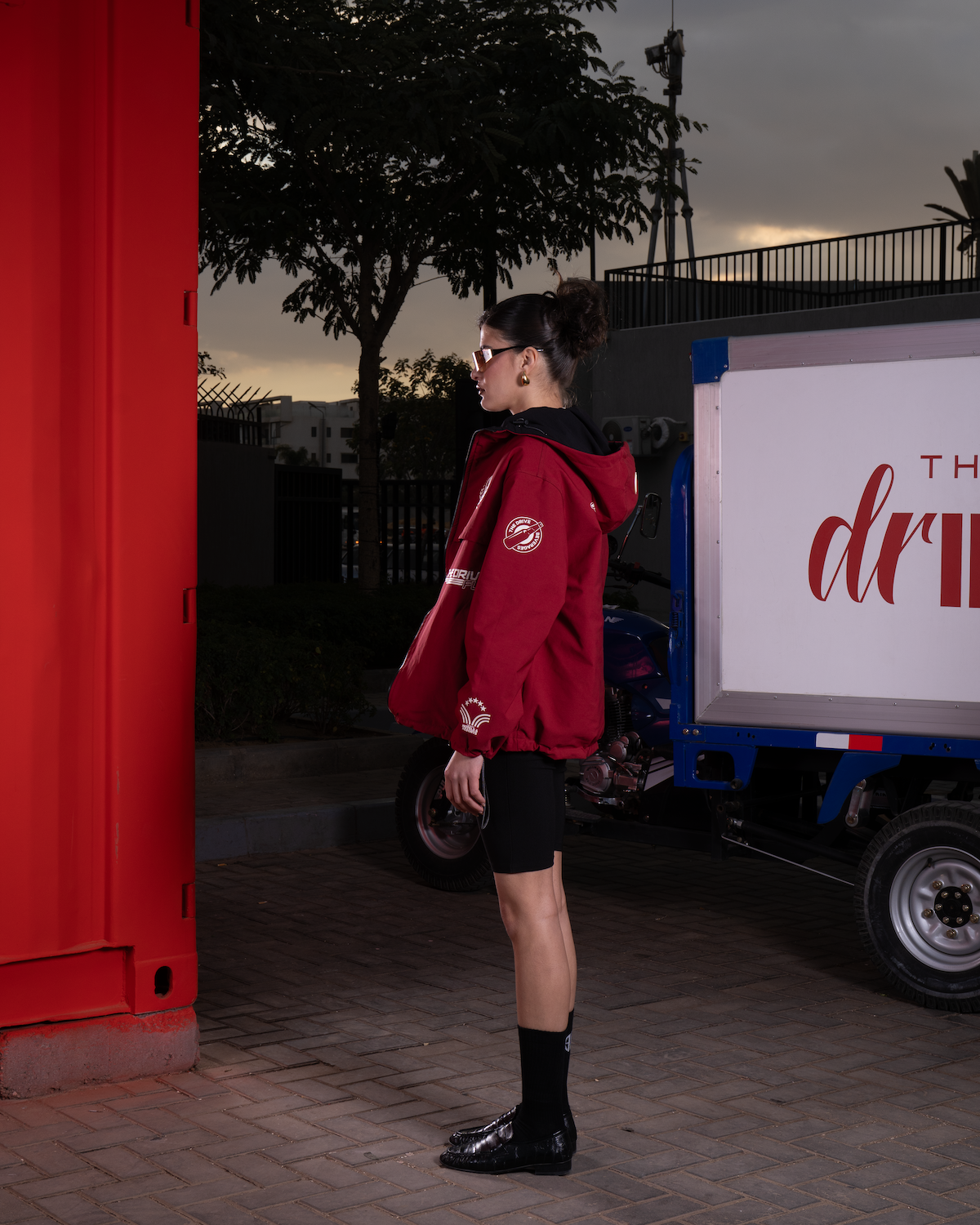 The red side delivers a bolder statement, finished with printed graphics across the front, sleeves, and back. Finished with a hood, front zipper, functional side pockets, and adjustable drawstrings at the hem.